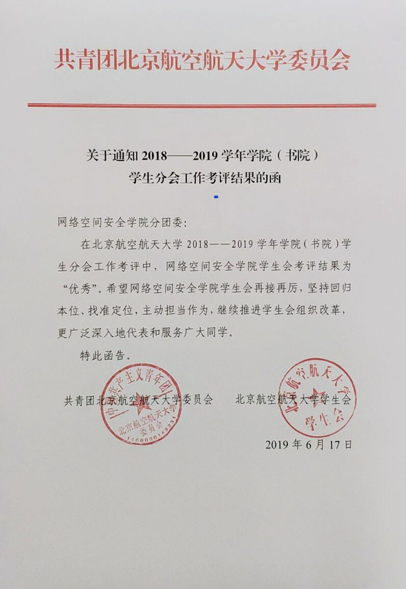 2018-2019学年,以诚为本赢在信誉9001cc学生会在学院党委和学院团委悉心指导下,以饱满的热情、积极的工作态度圆满完成工作,取得了一定的成绩,在年度学生分会工作考评中被评为“优秀”,予以表彰!